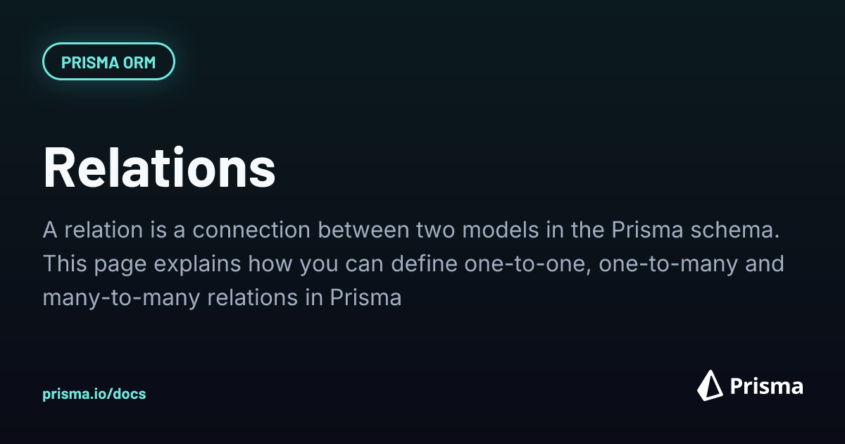RelationsA relation is a connection between two models in the Prisma schema. This page explains how you can define one-to-one, one-to-many and many-to-many relations in …